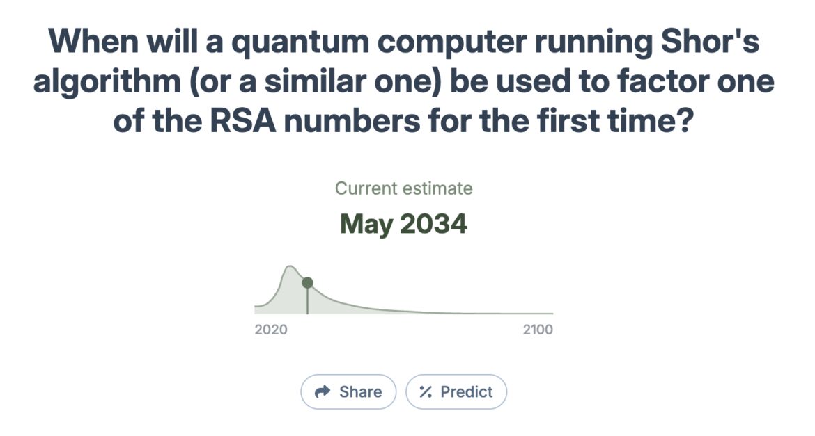 Metaculus, a prediction platform that tracks scientific advances, has sharply moved up the estimate for when a quantum computer using Shor’s algorithm will factor an RSA number.