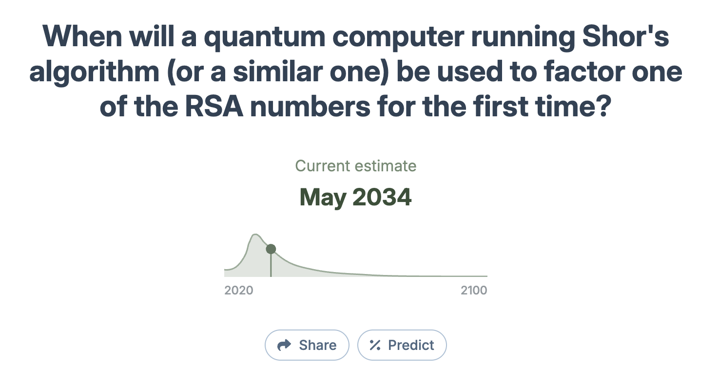 Ahead of schedule, Metaculus now predicts that quantum computers could factor an RSA number using Shor’s algorithm by 2034. This isalmost 20 years sooner than the previous forecast of 2052.