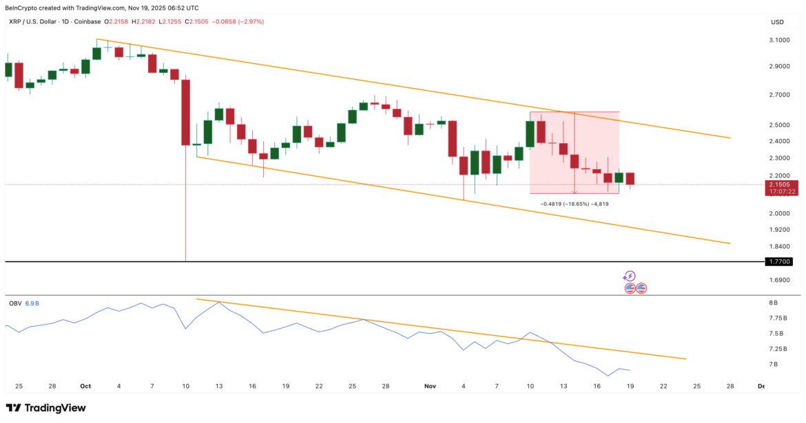 XRP price trades near $2.15 today after dropping over 18% since November 10. The token has spent the past month moving inside a bearish channel. And the latest structure now shows weakening volume, rising long-term selling, and the price sitting close to a key support.