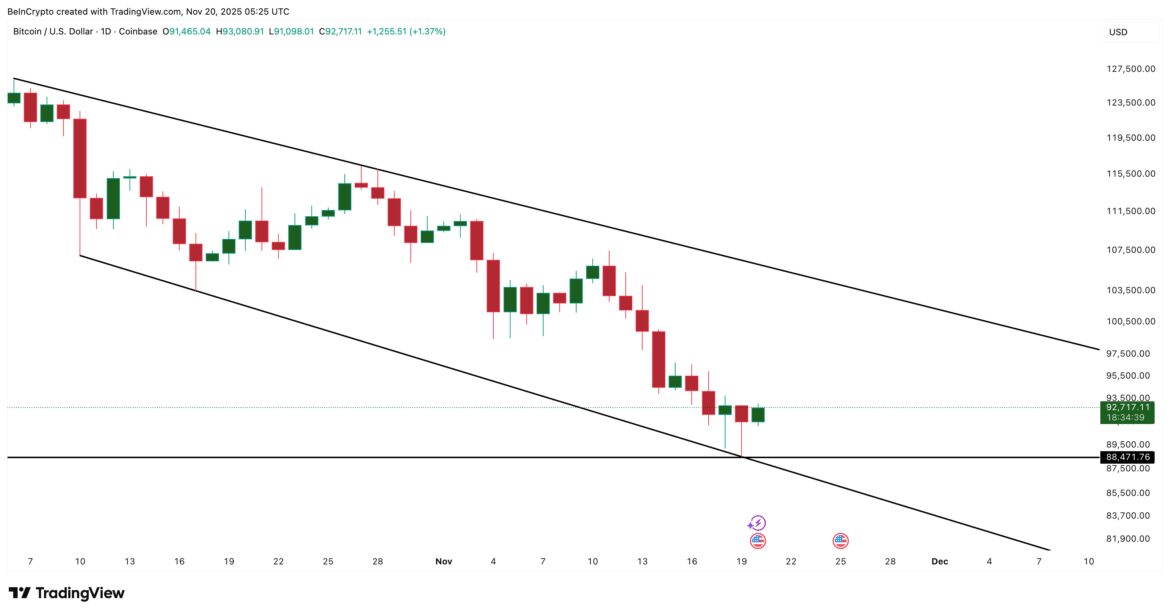 Bitcoin has bounced nearly 5% from today’s low of near $88,400, right at the edge of falling-wedge support. While the rebound was strong, the daily price chart shows a meager 2% uptick. It certainly doesn’t do justice to the strength the Bitcoin price showed over the past few hours.