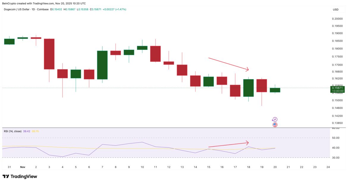 The clearest problem sits in the momentum data. Between Nov. 15 and Nov. 18, the Dogecoin price made a lower high, but the RSI made a higher high. RSI, or Relative Strength Index, measures whether buying or selling pressure is strong. When RSI climbs while the price makes a lower high, it forms a hidden bearish divergence.