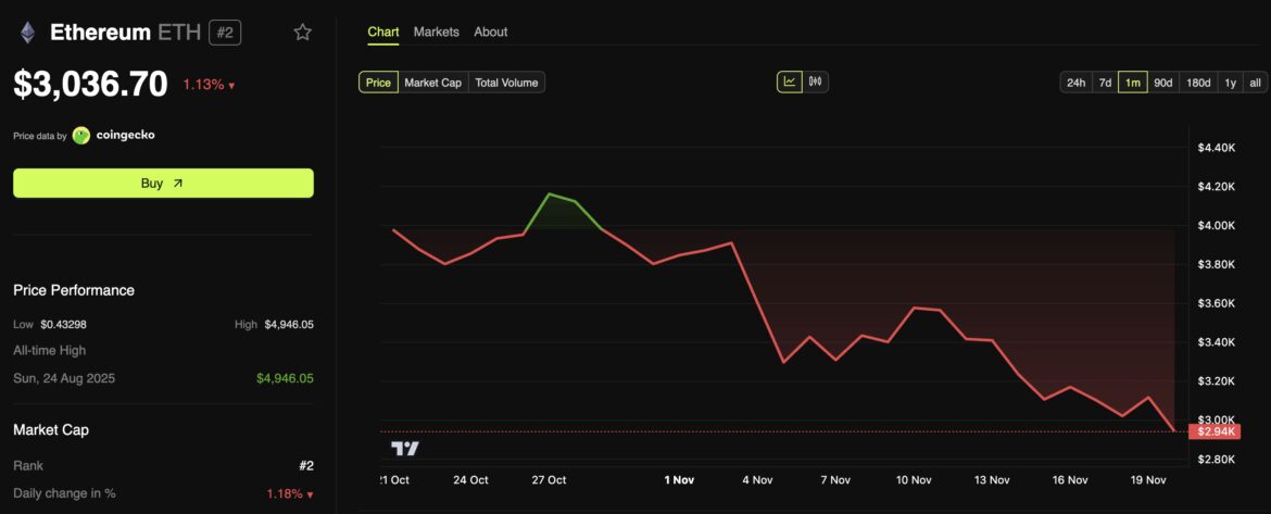 Ethereum (ETH) briefly dropped to near $2,870 on November 19, its lowest point since July, after the release of Federal Reserve minutes raised market uncertainty.