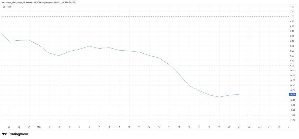 Aster’s negative correlation with Bitcoin is strengthening its position. At the time of writing, the correlation coefficient between Aster and BTC sits at -0.58, indicating that the two assets are moving in opposite directions. With Bitcoin continuing to decline on the daily chart, this negative relationship gives Aster room to rise even as the market weakens.