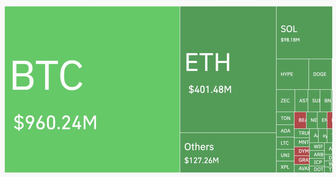 Bitcoin led all liquidations, with $929 million of its $960 million total from long positions. Ethereum (ETH) followed with $403.15 million, again mostly from leveraged longs.
