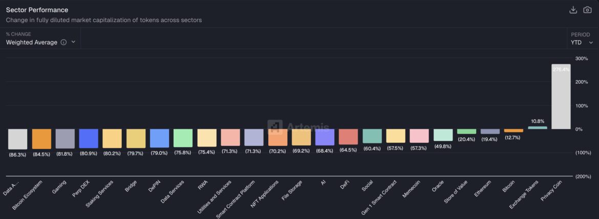 Privacy coins have surged 276.4% year-to-date, making them the strongest and one of only two sectors showing positive returns this year.