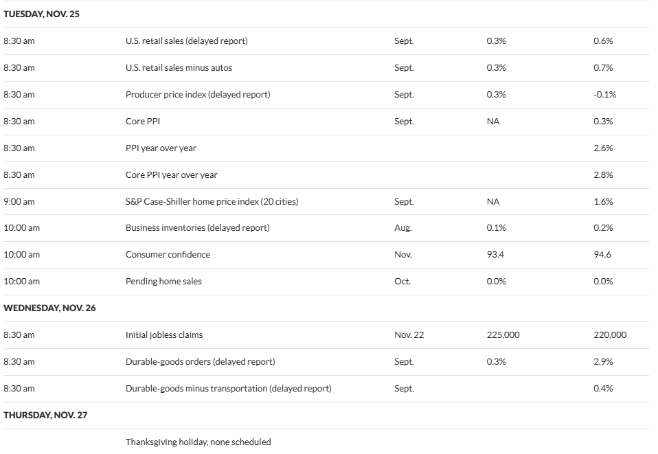 According to MarketWatch’s economic calendar, Tuesday, November 25 at 8:30 a.m. ET brings both September retail sales and the Producer Price Index (PPI), while Wednesday delivers initial jobless claims data.