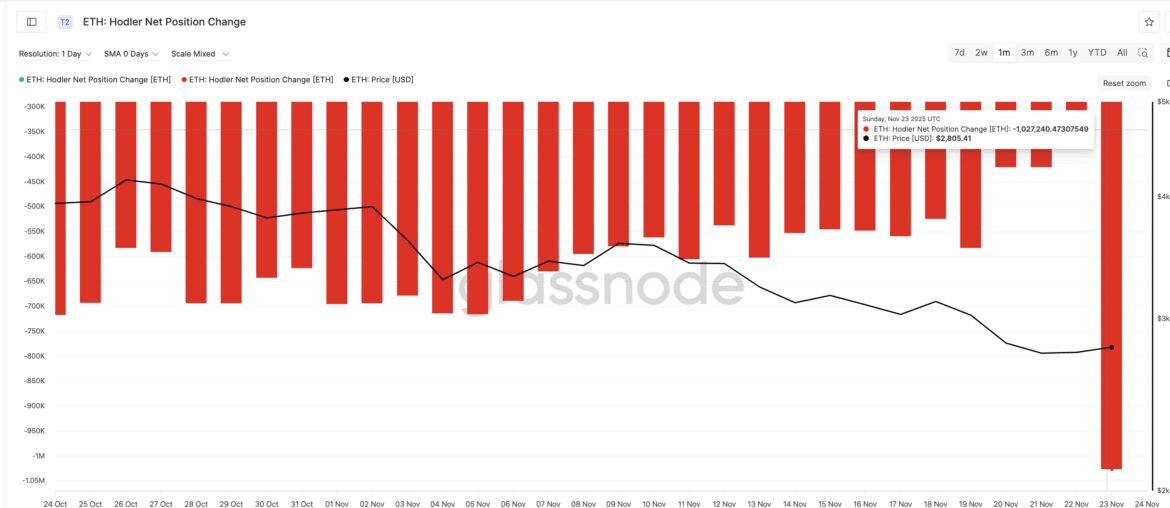 On November 22, net selling from these wallets was about 334,600 ETH. On November 23, it jumped to 1,027,240 ETH — a 300% spike in one day. This is a major exit from long-term holders and adds heavy supply at a time when ETH already trades in a broader downtrend.