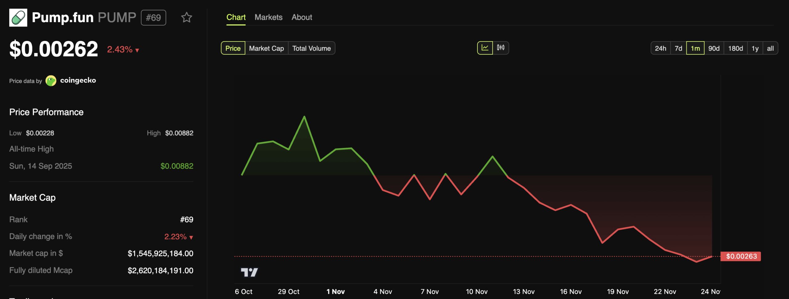 Lastly, PUMP is also facing market headwinds. BeInCrypto Markets Data shows that PUMP has declined 22.2% over the past week. At the time of writing, the altcoin was trading at 0.00262, a decrease of 2.43% over the past 24 hours.
