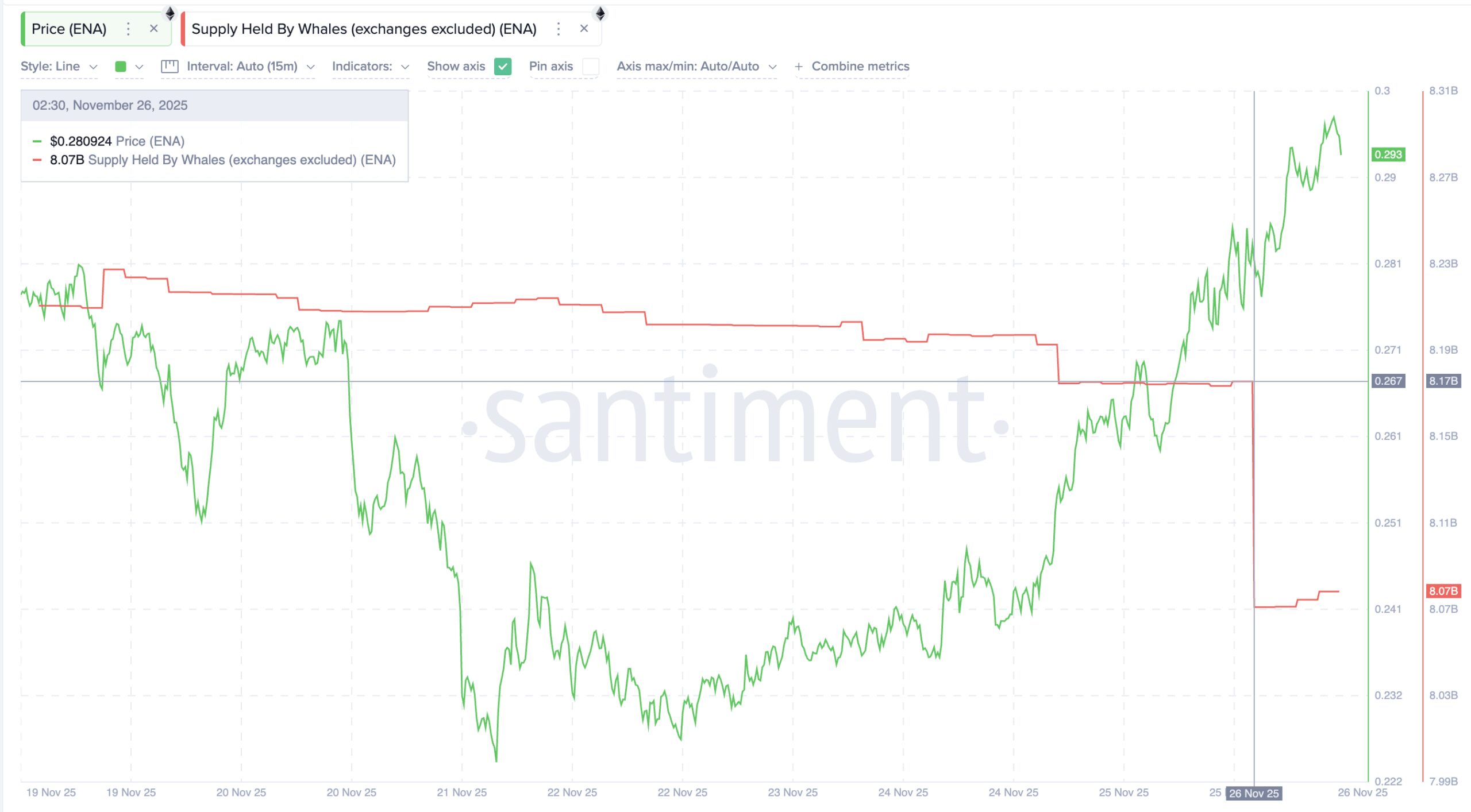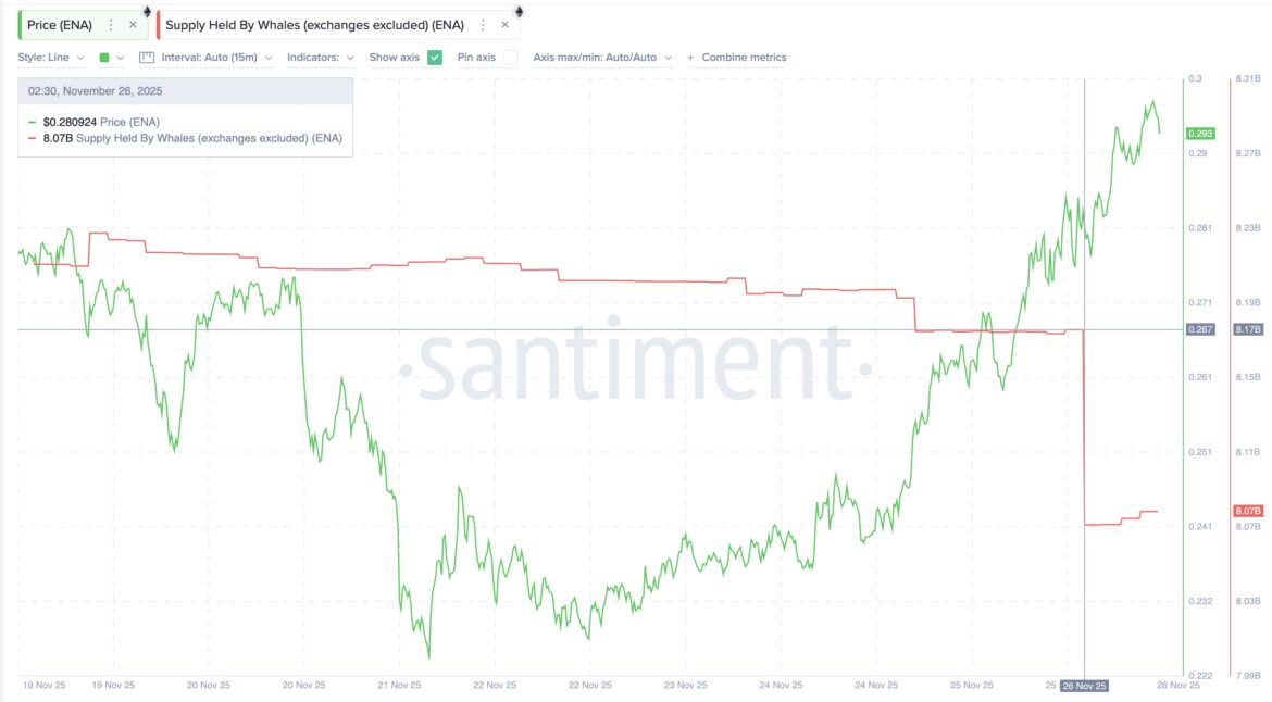 Over the past 24 hours, whale holdings dropped from 8.17 billion to 8.07 billion ENA. That’s a reduction of nearly 100 million ENA, worth about $28 million at current prices.