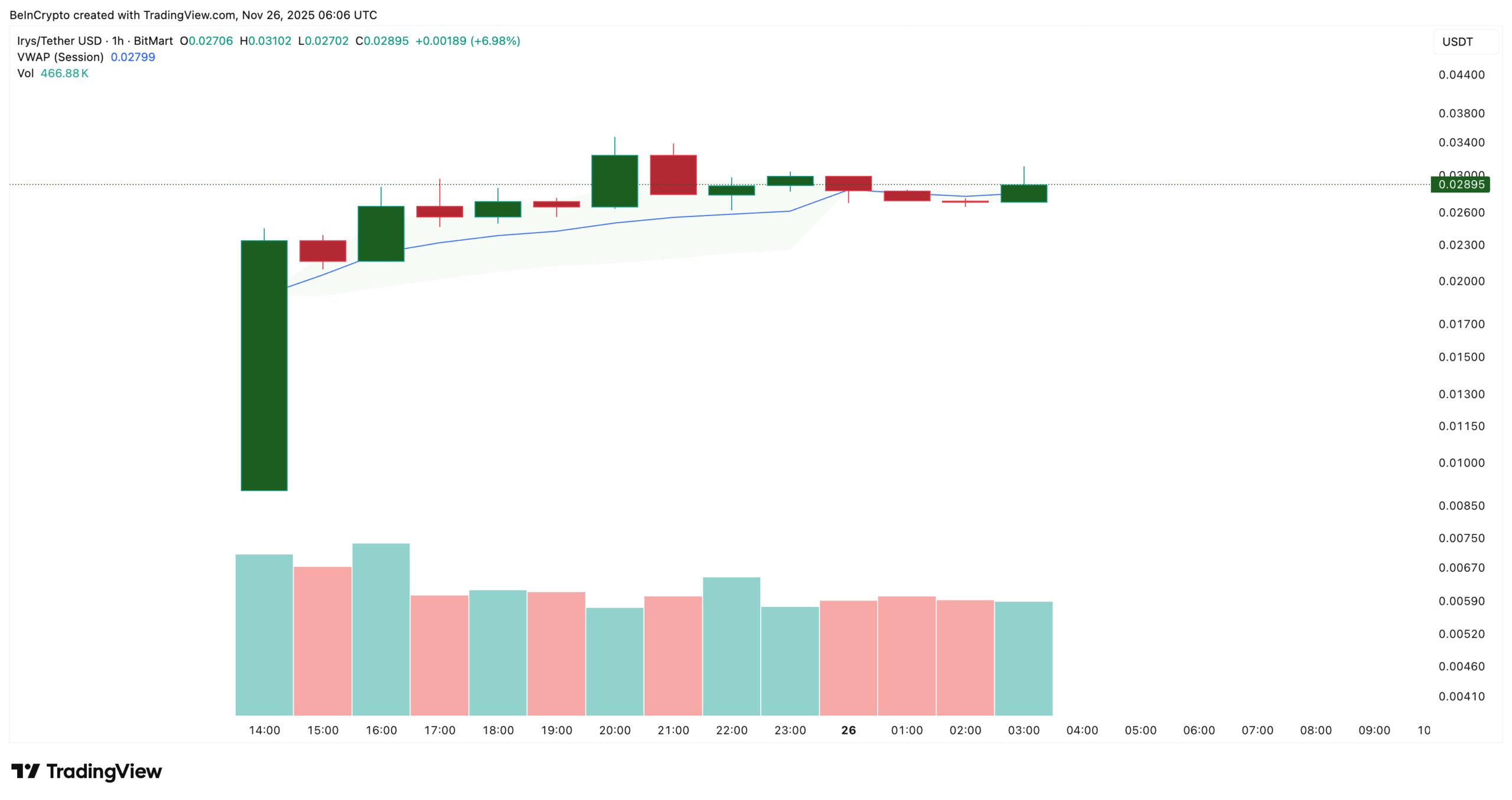 On the 1-hour chart, the IRYS price is using the volume-weighted average price (VWAP) as its main guide. VWAP tracks the average trading price in a session, but weights each trade by its volume, so it shows where the “real” bulk of trading is happening.