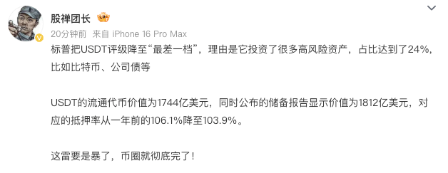 S&P Global Ratings downgraded Tether’s USDT stablecoin stability score from constrained to weak, citing increased exposure to volatile assets like Bitcoin. This move triggered intense debate on Chinese social media, with traders expressing concerns ranging from skepticism to outright panic.