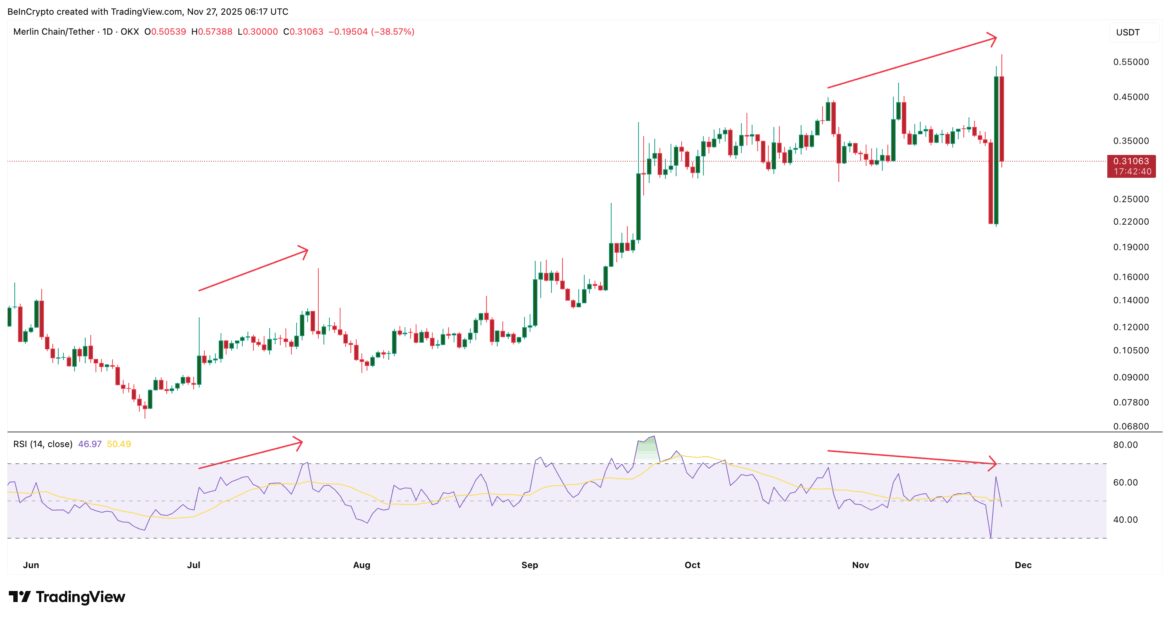 The past month breaks that pattern. Between October 26 and November 26, the Merlin Chain price made a higher high. RSI produced a lower high. That is standard bearish divergence. It often appears near the end of an uptrend, signaling that the next leg may turn down.
