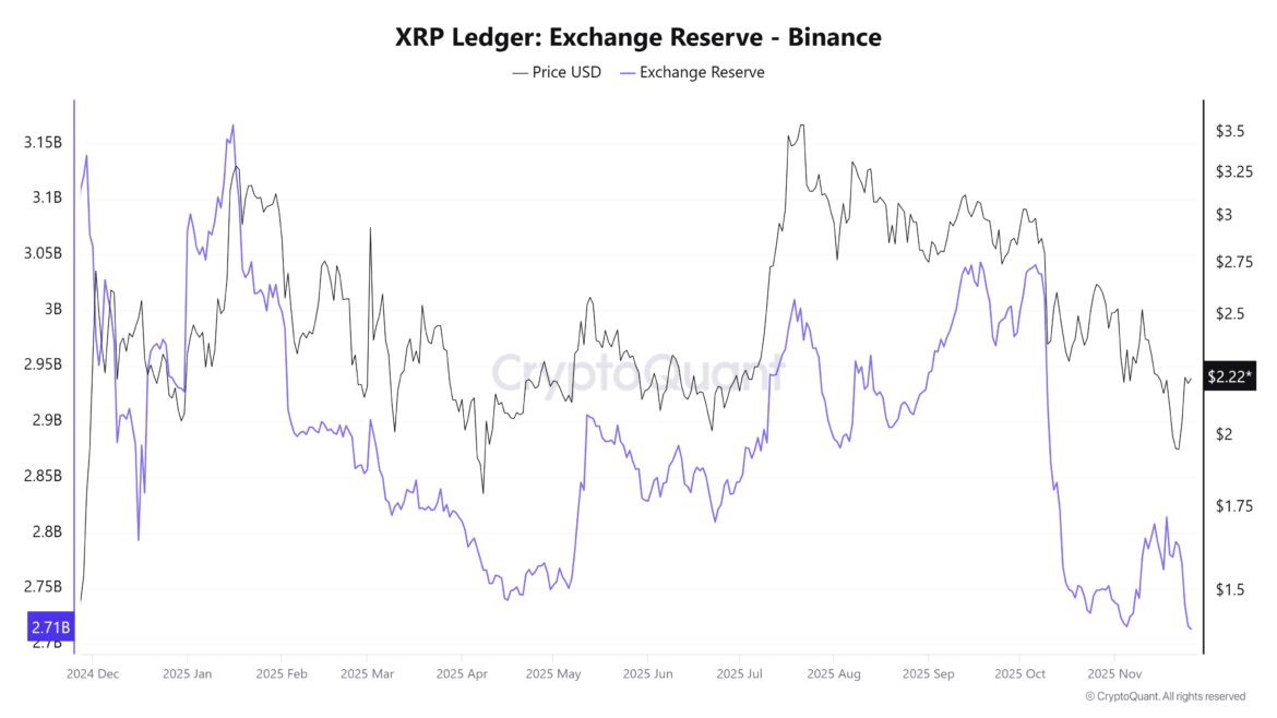 On-chain data from CryptoQuant, as of November 27, 2025, indicated that the XRP balance held on Binance had dropped to a 12-month low of 2.71 billion XRP.