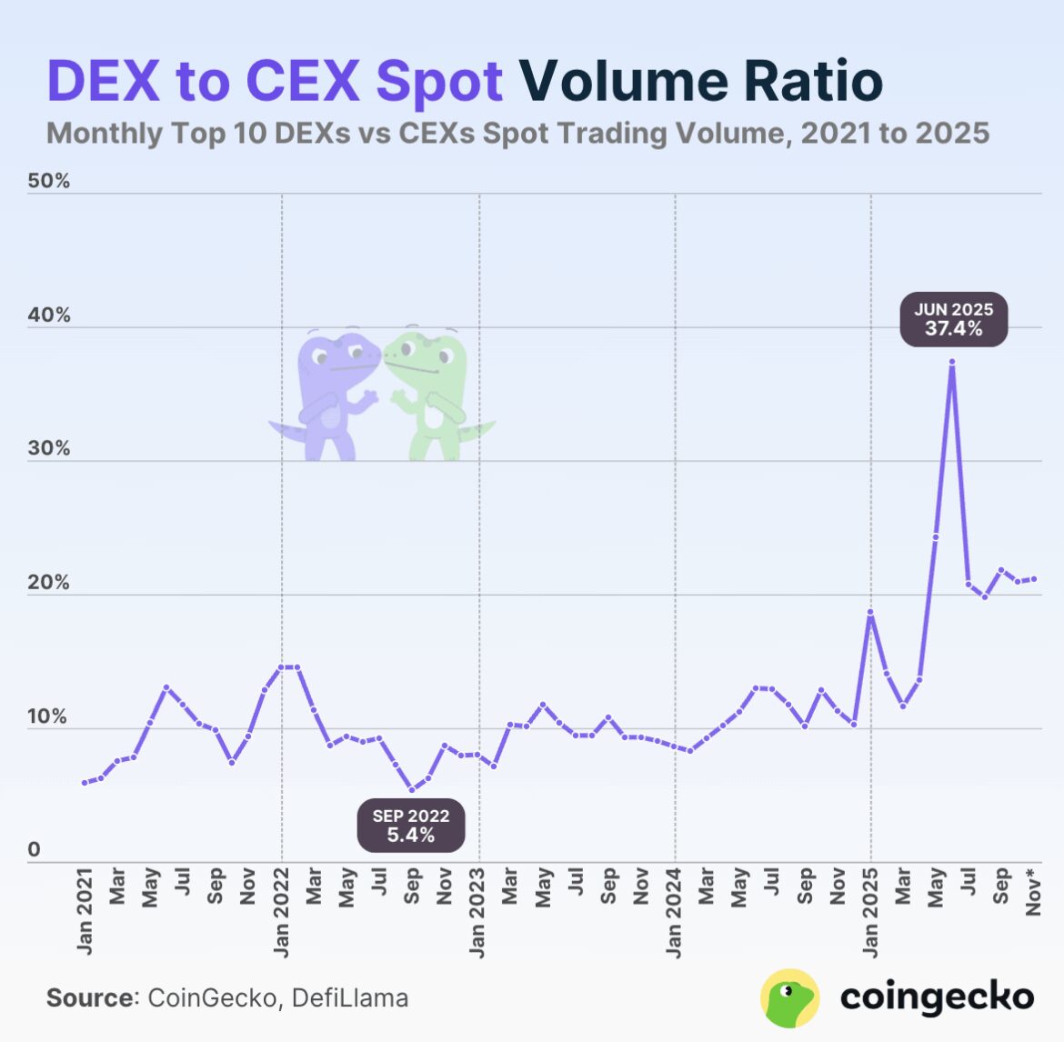 Spot DEX trading volume, measured as a share of global spot volume, has climbed from 5.4% in September 2022 to 21.19% in November 2025. June 2025 peaked at 37.4%, the highest level on record. This shows users are moving more spot activity on-chain even when the broader market is weak.