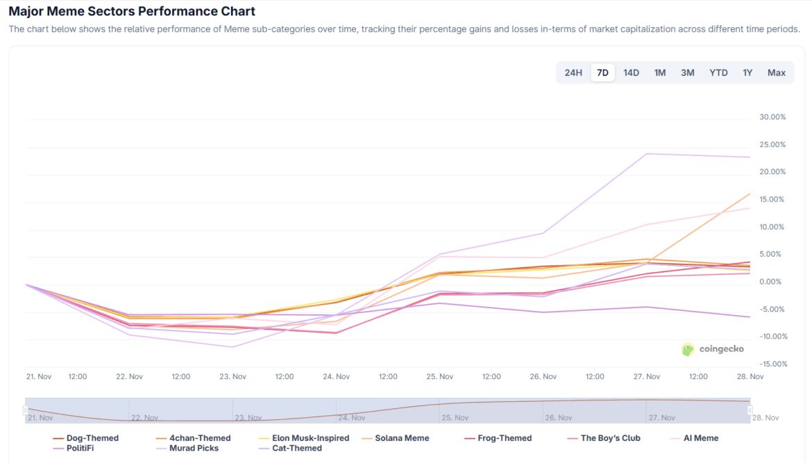 Data from Coingecko indicates that most meme sectors recorded positive weekly returns in the final week of November. The exception was the political meme sector (PolitiFi), which turned negative due to unlock pressure, causing Official Trump (TRUMP) to drop sharply. Other sectors recorded average gains ranging from 3% to over 20%.