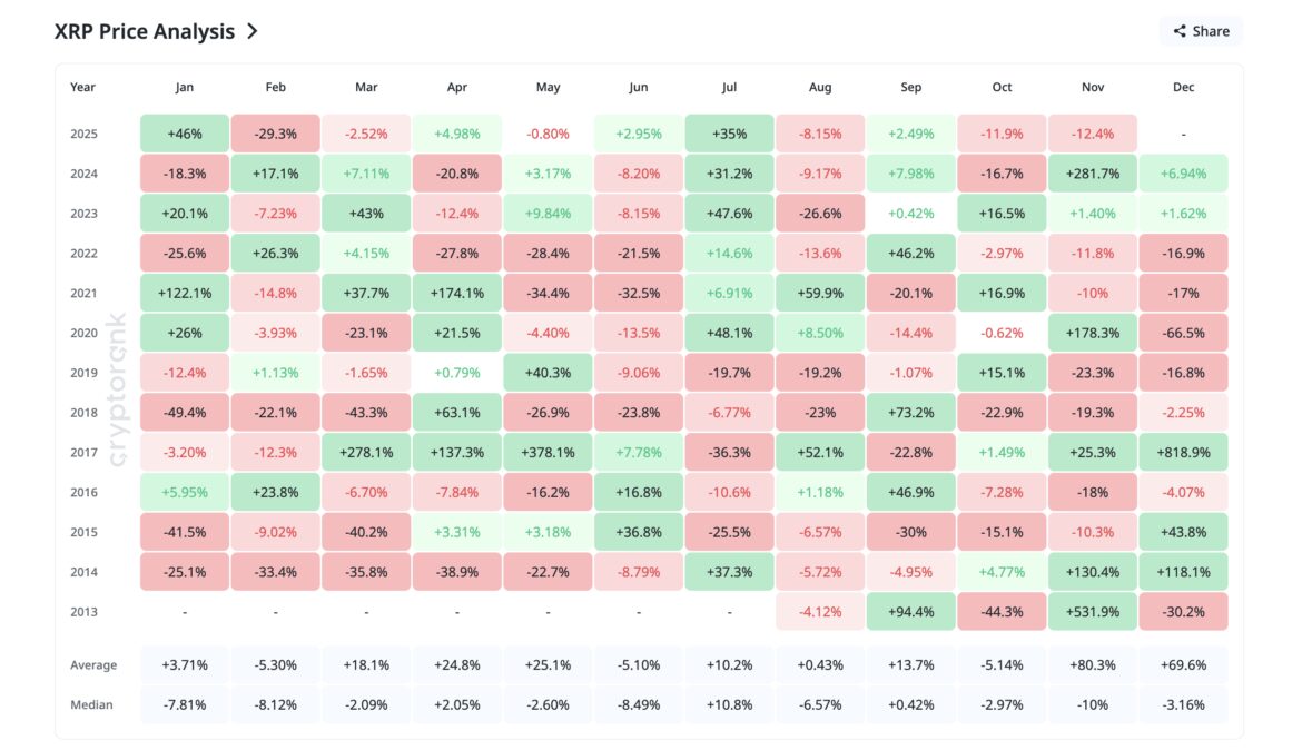 XRP price enters December after a weak November, with the token down nearly 13% for the month. December has often appeared strong on paper due to the 2017 outlier, but recent years have shown much tamer returns.