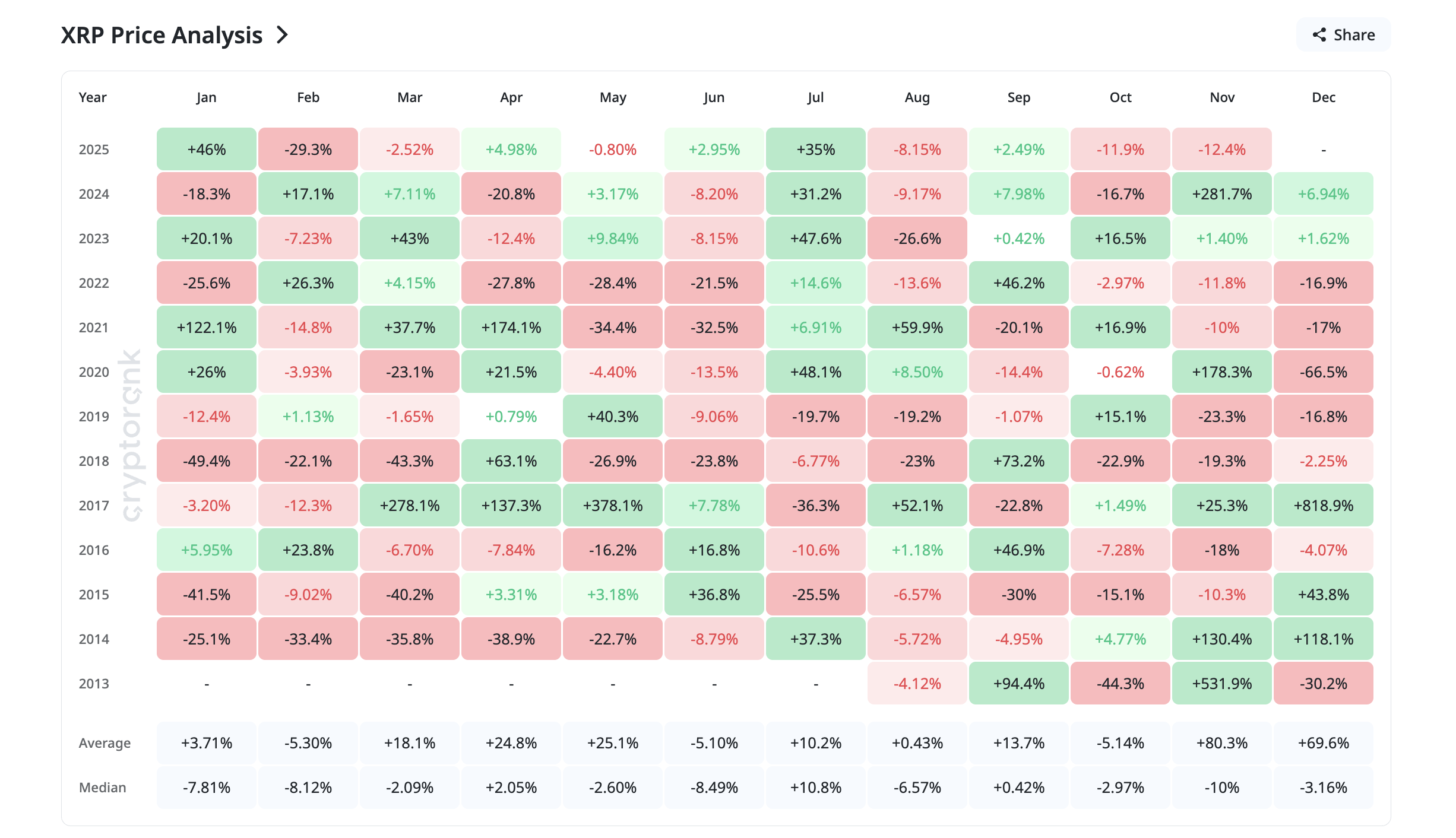 At first glance, December looks like a strong month for XRP, with an average gain of about 69.6%. But the median return is –3.16%, showing that the +818% surge in 2017 inflated the long-term average.