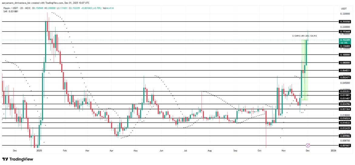 PIPPIN has delivered one of the strongest performances of the week, soaring 451% over seven days. The meme coin now trades at $0.152, marking a 10-month high.