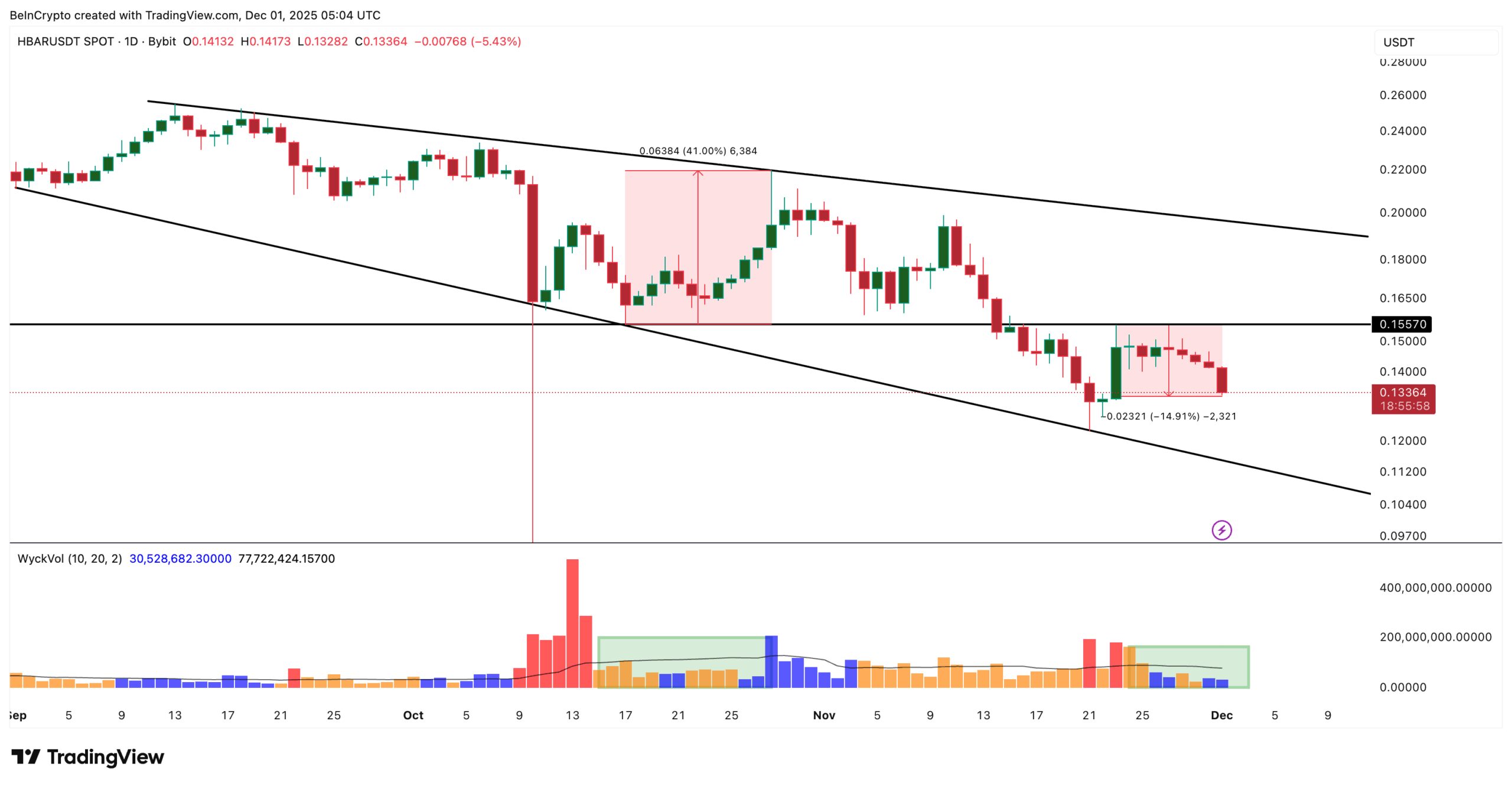A second clue appears in the MFI (Money Flow Index), which tracks buying and selling pressure using both price and volume. Between November 23 and December 1, the HBAR price kept making lower highs while MFI made higher highs. That divergence shows dips are being quietly bought. A similar divergence formed between October 6 and October 24 and led to a 33% jump once it completed.