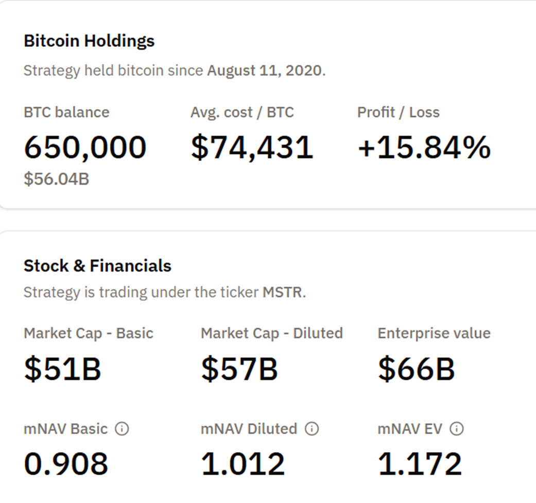 • MicroStrategy’s stock trades below 1.0x mNAV—meaning the company is valued at less than the Bitcoin it owns.