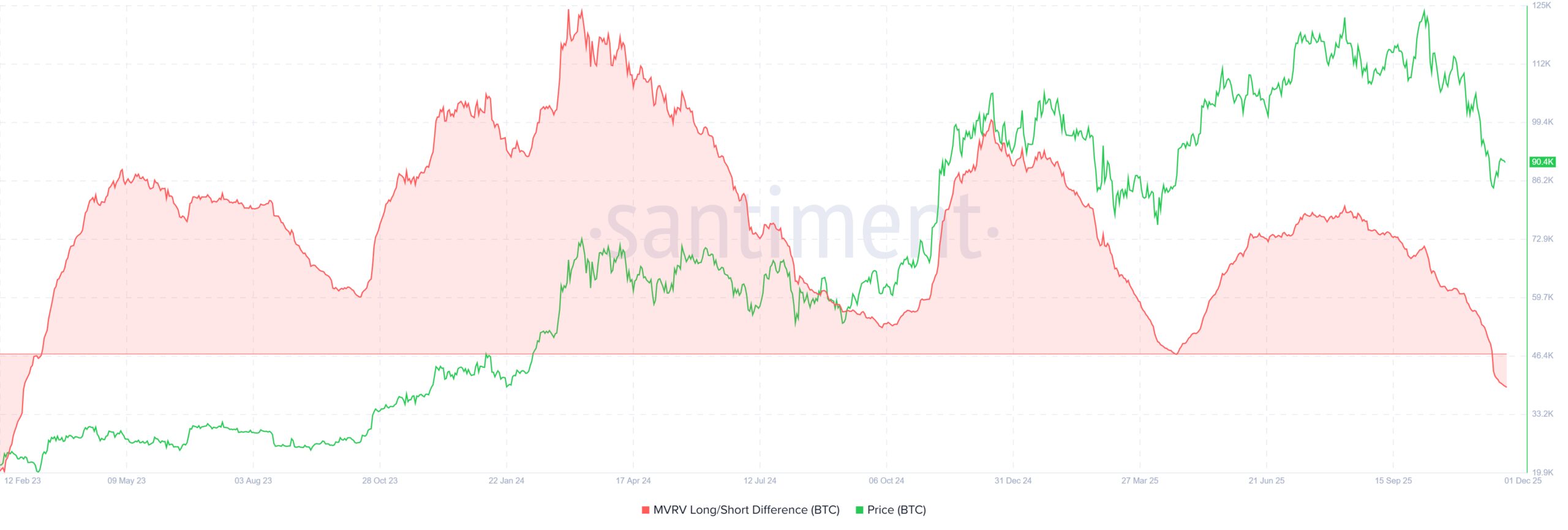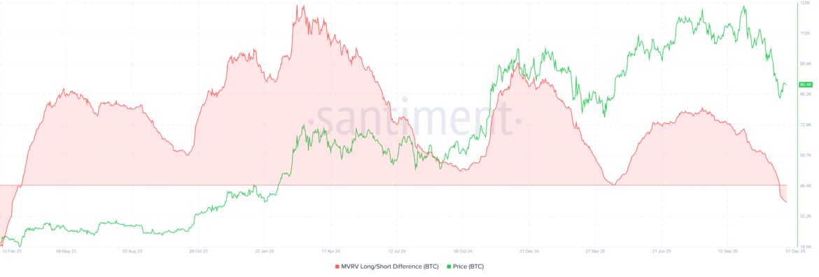 The MVRV Long/Short Difference has slipped into negative territory for the first time in nearly three years. This shift signals that short-term holders now hold more unrealized profit than long-term holders, a rare dynamic that last appeared in early 2023. Historically, such periods lead to heightened selling because short-term investors tend to exit positions quickly when they see profit.