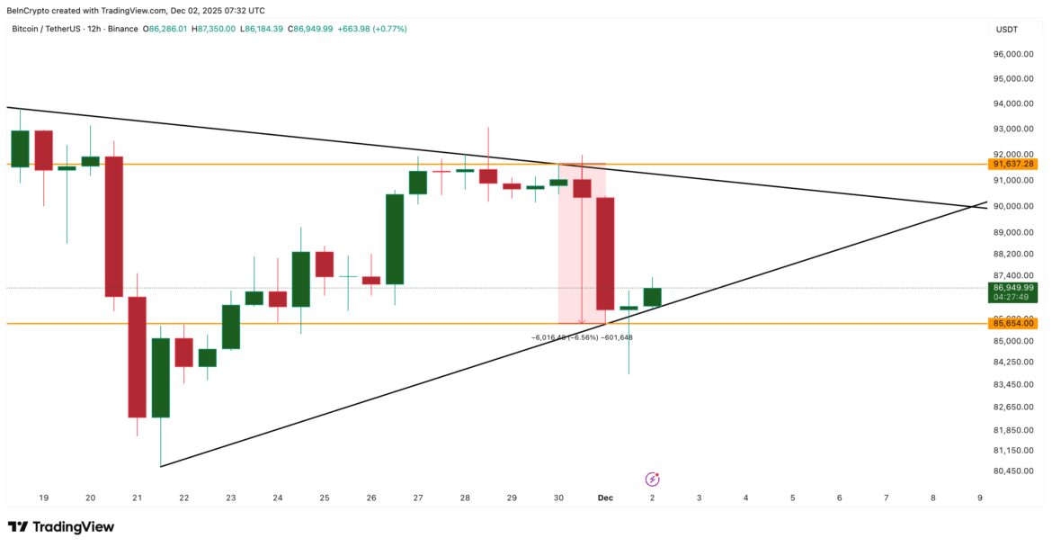 The Bitcoin price has been moving inside a broad triangle on the 12-hour chart. The upper trend line rejected all breakout attempts on November 28 and November 30. A breakdown attempt also showed up briefly on December 1, but buyers managed to recover before the candle closed.