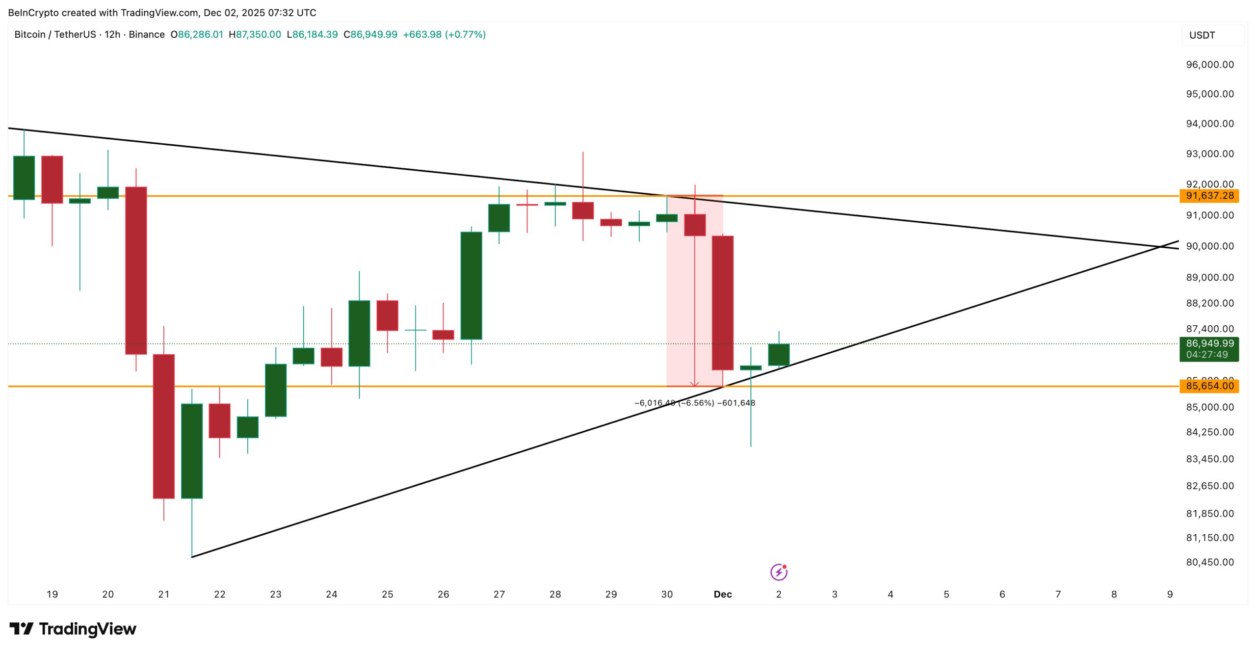 Downside path: A 12-hour close below $85,664 breaks the triangle, and likely pulls Bitcoin toward $83,811. If the selling continues, the next zone sits at $80,599, the current cycle low.