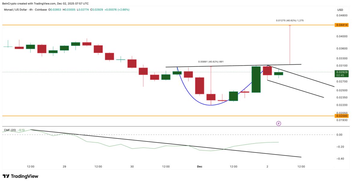 But invalidation sits close. A 4-hour close below $0.025 breaks the handle and weakens the structure. If the Monad price falls below $0.021, the trend turns fully bearish.