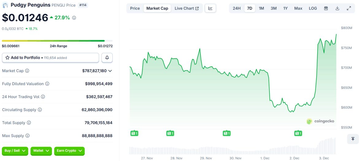 PENGU, the Pudgy Penguins community token, experienced a notable surge during the first week of December. It has increased by almost 30% in the last 24 hours, trading at $0.01246 as of this writing.