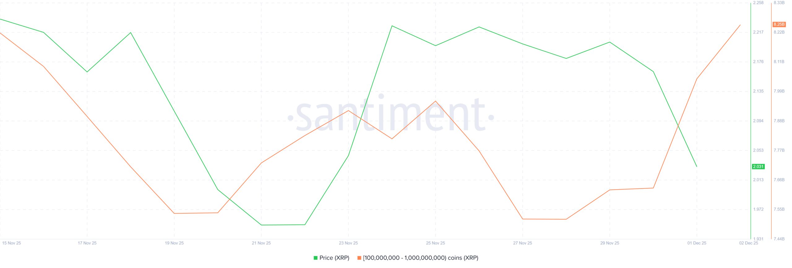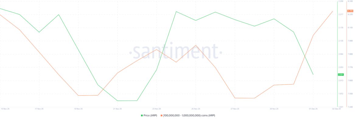 Whale buying has intensified as XRP approached the $2.00 psychological level earlier this week. On-chain data shows that wallets holding between 100 million and 1 billion XRP collectively accumulated 620 million XRP in just a few days. At current prices, this accumulation is worth more than $1.36 billion.