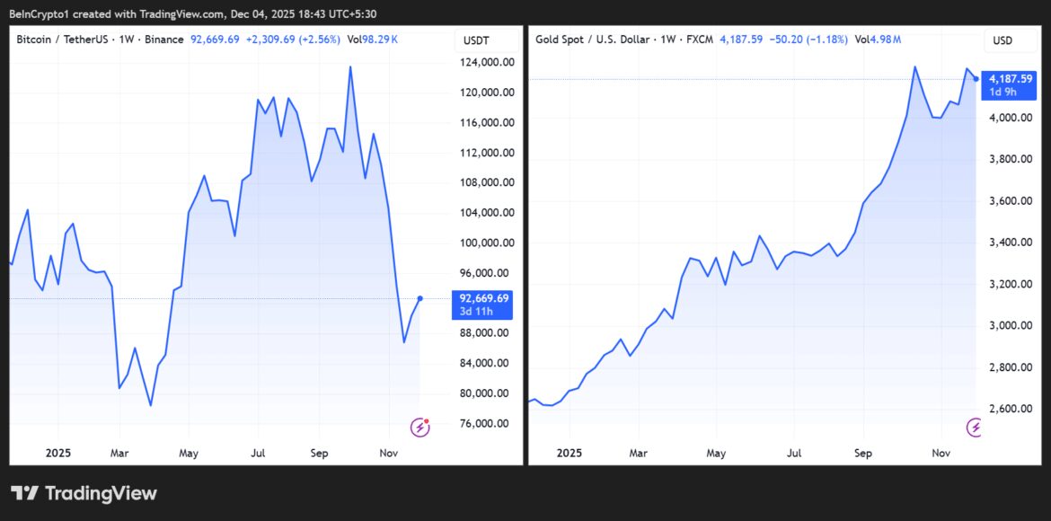 As of this writing, Bitcoin was trading for $92,669, down by over 2% from its 2025 opening price of $94,591. Meanwhile, gold was exchanging hands for $4,187 as of this writing, up by over 57% from its 2025 opener of $2,657