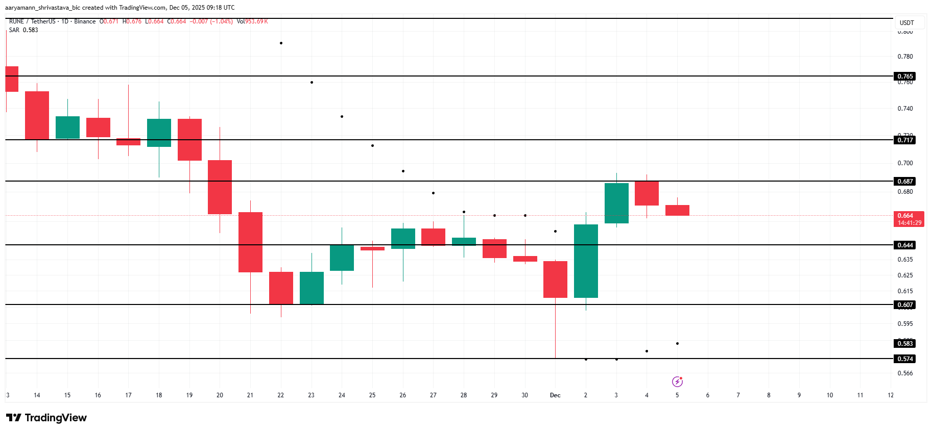 If momentum builds, RUNE could break above the $0.687 barrier. The Parabolic SAR currently sits below the candlesticks, signaling an active uptrend that may push the price toward $0.717 or even $0.765. Sustained bullish sentiment will be essential for extending this move.