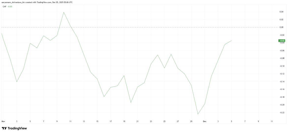 The Chaikin Money Flow (CMF) indicator is showing a sharp uptick, signaling a rapid slowdown in outflows. This trend is notable because it suggests that selling pressure is easing meaningfully. As investors pull back from offloading tokens, sentiment gradually shifts toward a more constructive outlook.