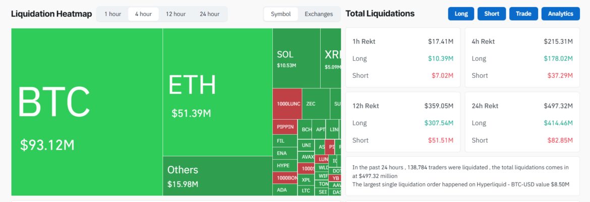 The catalyst was a cascade of forced long liquidations. Nearly $500 million was wiped out across exchanges, including around $420 million in long positions, and over 140,000 traders were liquidated in a 24-hour window.
