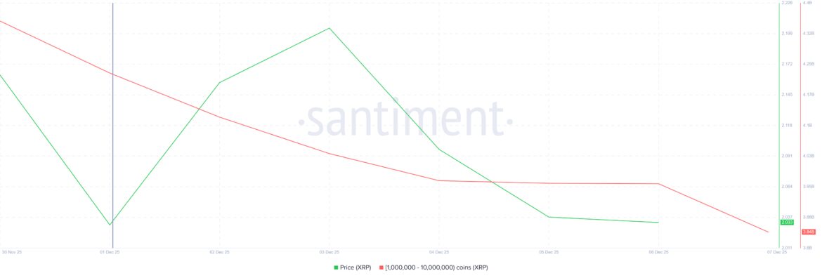 Whales have begun offloading substantial portions of their holdings. Over the past seven days, wallets holding between 1 million and 10 million XRP have sold more than 390 million XRP, worth over $783 million at current prices.