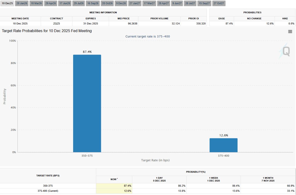 The Federal Open Market Committee (FOMC) will reveal its interest rate decision on Wednesday, December 10, 2025, at 2:00 p.m. ET. According to the CME FedWatch tool, there is an 87.4% chance of a rate cut, a 12.6% probability of no change, and no expectation of an increase.