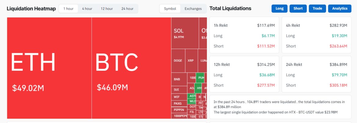 Liquidation data confirms that futures markets absorbed the move aggressively. More than $300 million in total crypto liquidations occurred over the past 12 hours, with Bitcoin accounting for over $46 million and Ethereum above $49 million.