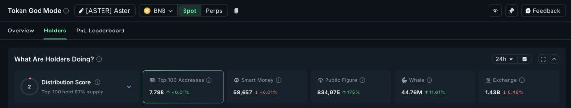 Aster is showing one of the strongest accumulation signals from crypto whales in the past 24 hours. The token is down 4% today and more than 10% over the last month, yet whales have added 11.61% to their holdings, increasing their stash to 44.76 million ASTER at a price near $0.93. This means Aster whales added roughly 4.67 million tokens, priced at almost $4.34 million at current prices.