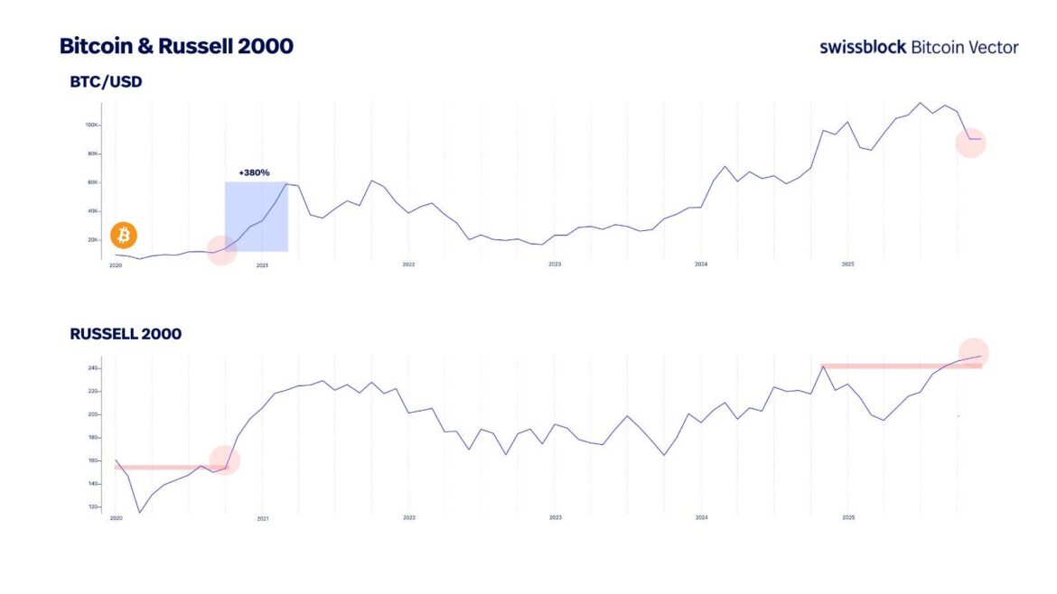 The Bitcoin Vector — an institutional Bitcoin report published by Swissblock — noted that in late 2020, the Russell 2000 broke through new highs and later turned that level into support. Bitcoin surged 380% after that.