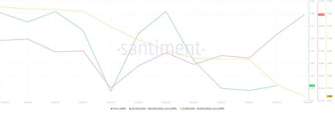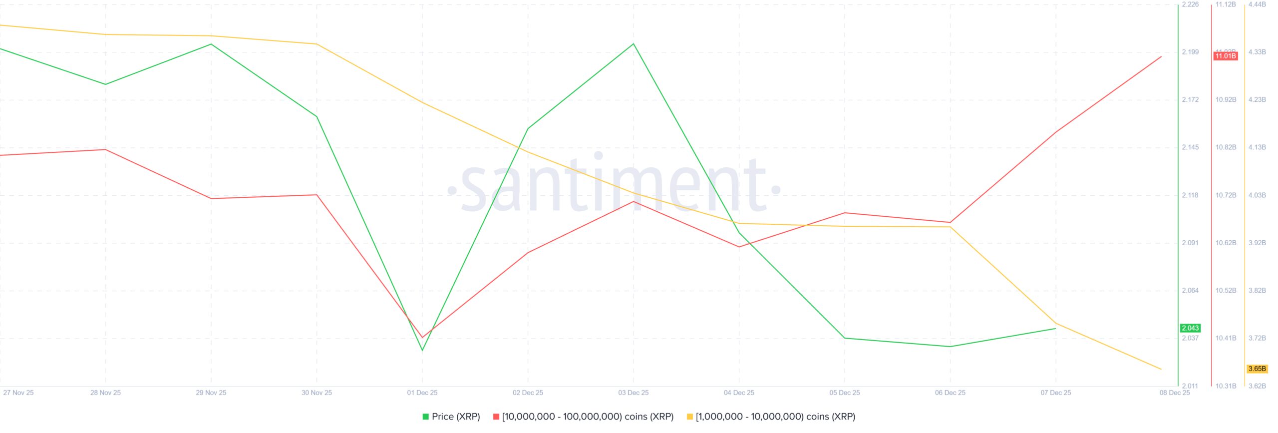 Whale activity shows a notable redistribution of XRP supply between major cohorts. Addresses holding 1 million to 10 million XRP offloaded more than 330 million XRP in the past four days, reflecting skepticism among mid-sized whales. Their selling pressure, however, did not send supply to exchanges or retail holders.