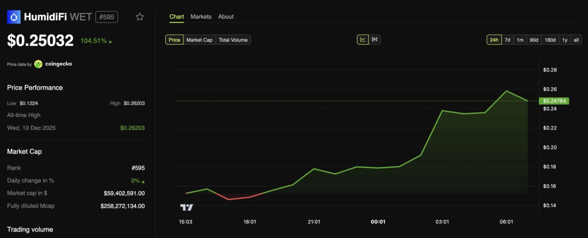 HumidiFi (WET) has emerged as the top daily gainer in the cryptocurrency market today, rising over 100% in the past 24 hours.