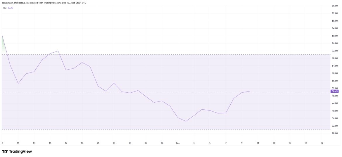 The RSI shows that bullish sentiment is strengthening as Zcash begins regaining traction. The indicator has climbed above the neutral 50.0 mark for the first time in nearly two weeks, signaling improved market confidence. A move into the positive zone often serves as an early sign of trend reversal, which could support ZEC’s continued upward move.
