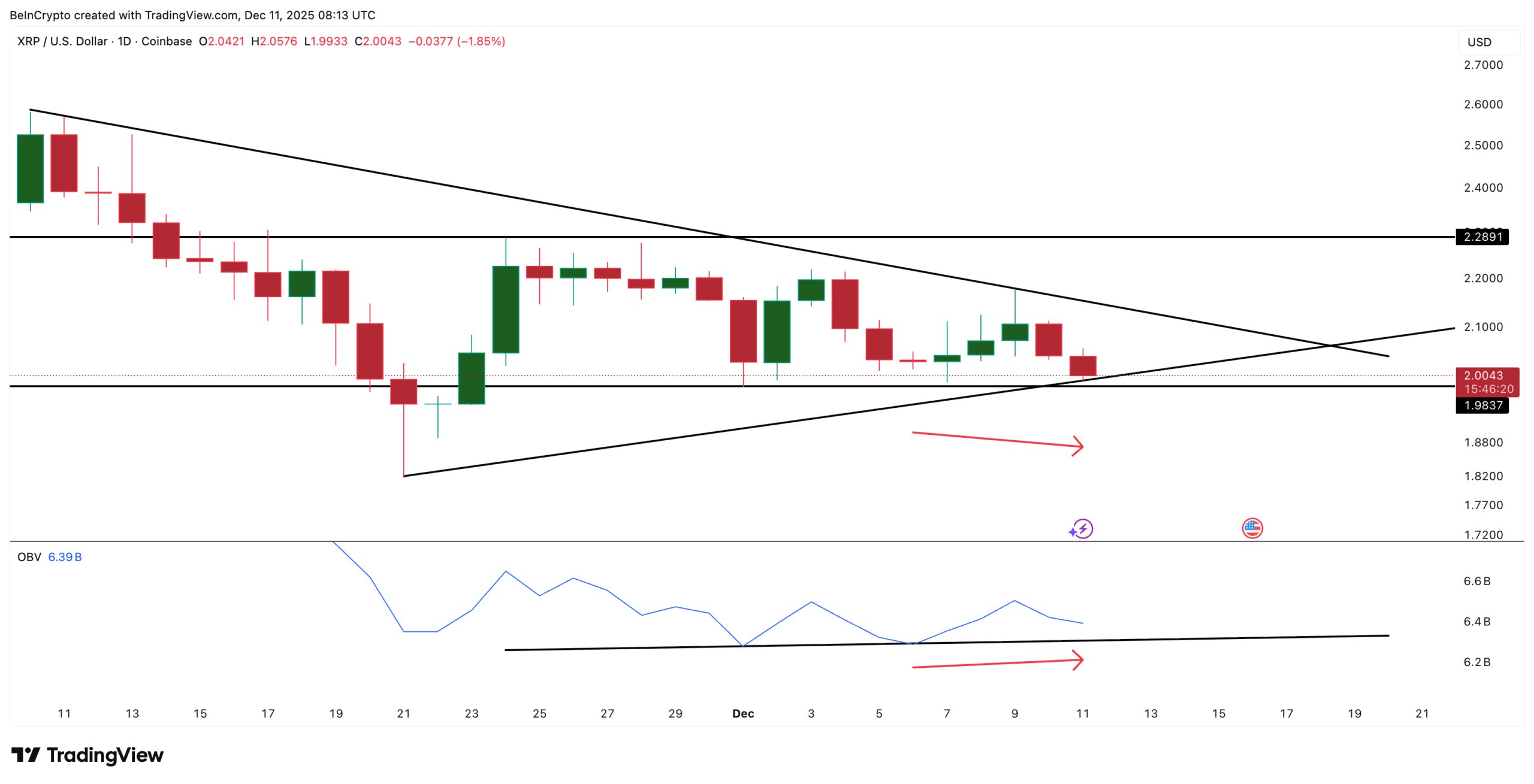 XRP has been trading between $2.28 and $1.98 since late November. This range shows that buyers and sellers have been evenly matched. But the lower side of this range recently produced something new. The price touched the bottom trend line of a symmetrical triangle. A symmetrical triangle forms when buyers and sellers slow down at the same pace, which often signals an aggresive move.