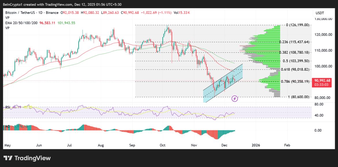 The bullish Volume Profiles (green horizontal bars) reveal a significant high-volume node around the 78.6% Fibonacci retracement level, suggesting bulls could defend $90,358 as critical support.