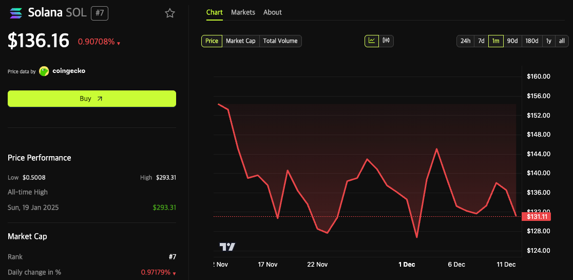 Despite the landmark nature of the transaction, Solana’s native token, SOL, has shown a limited price reaction. As of December 12, SOL trades at approximately $136, down 2.25% over the past week. The token briefly spiked above $145 on December 9-10 before retreating to current levels.