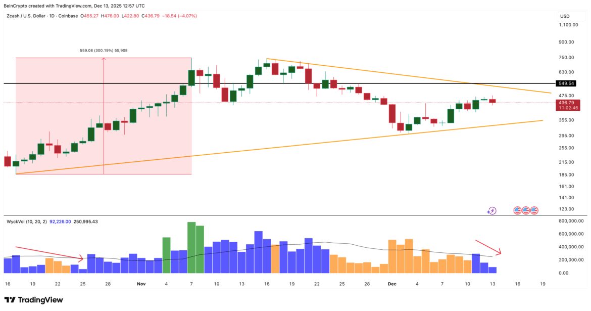 For the bullish structure to continue, the Zcash price needs to break out of the triangle. The key level to watch is $511, a 24% move from current levels. A clean daily close above this level would confirm a bullish resolution and signal renewed buyer control.