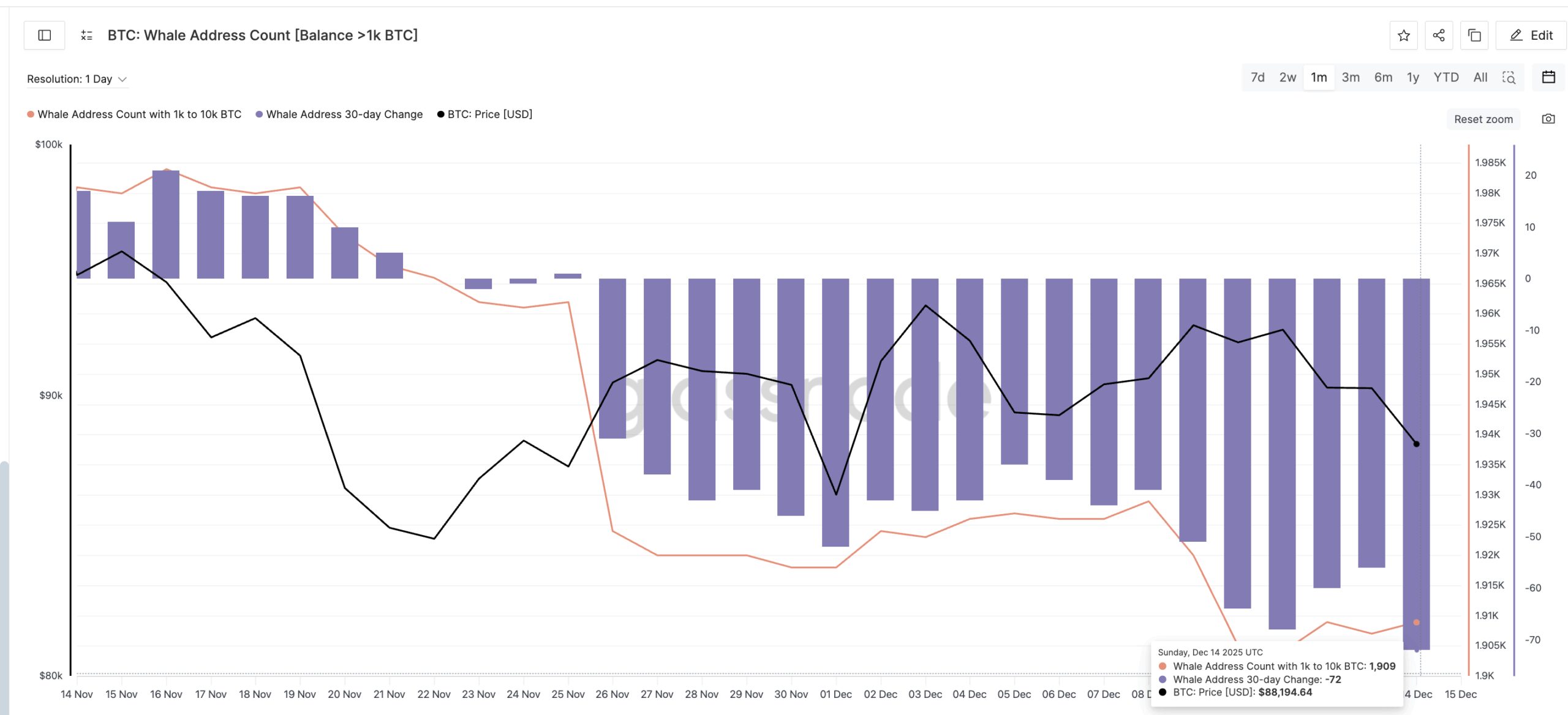Bitcoin’s whale address data shows clear weakness. The 30-day change in whale addresses holding 1,000–10,000 BTC has dropped to −72, its lowest level since late November. The total whale count is also sitting near monthly lows. This confirms that large holders have been reducing exposure rather than accumulating.
