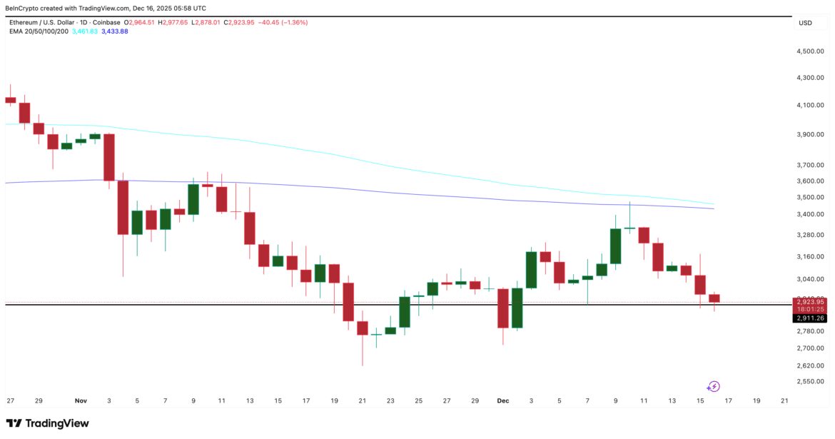 From a long-term perspective, this strengthensEthereum’s credibility with traditional finance. In the short term, however, price action remains under pressure. On the daily chart, Ethereum is approaching a bearish EMA crossover, where the 100-day exponential moving average is close to slipping below the 200-day EMA.