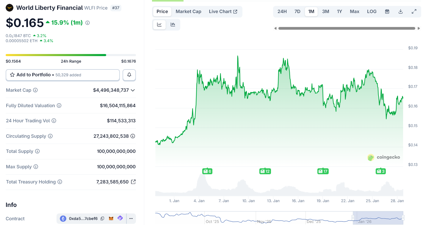 World Liberty Financial’s price has seen heightened volatility following months of politically driven momentum. The Trump-backed token posted strong macro gains during renewed discourse around Greenland’s strategic future.