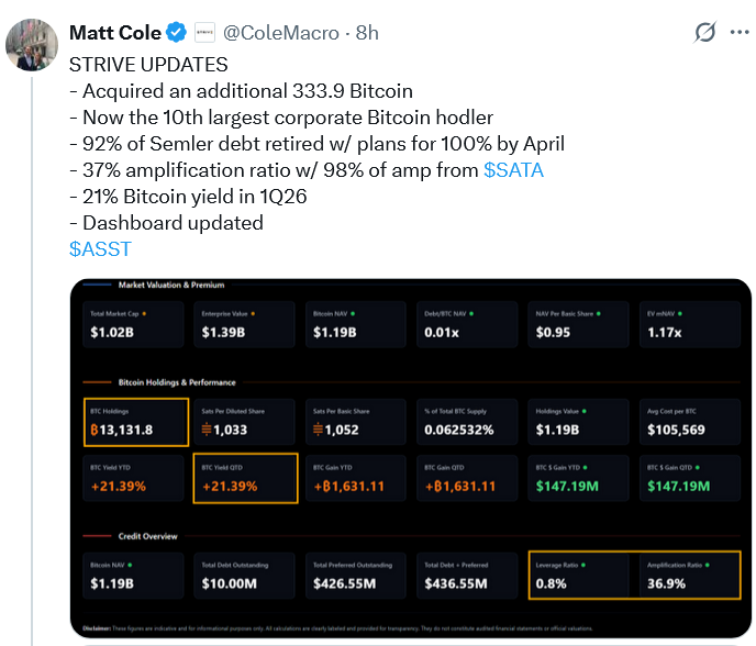 Bitcoin treasury company Strive said it has retired 92% of the debt it inherited after acquiring Semler Scientific earlier this month, and bought another 334 Bitcoin, following the closure of a preferred stock offering.